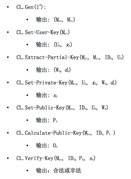 Al-Riyami和Paterson在2001年提出无证书的密码体制后引起广泛的关注。学术界进行了大量的安全模型理论研究并构造了一系列包括无证书加密算法、签名算法和密钥交换协议等安全机制。遗憾的是,由于Al-Riyami和Paterson对CL-PKC中密钥生成算法的定义方法导致这类模型无法覆盖隐式证书系统,生成的密钥对难以结合标准的如ECC密码算法使用。一些基于标准算法的无证书签名算法构造都被证明不能满足 Al-Riyami和Paterson的安全模型。下面简单描述AP-CL-PKC中的密钥生成方法(CL-KGA),并分析其局限性。AP-CL-PKC由以下五个函数构成: