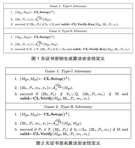 基于以上函数定义我们可以进一步定义密钥生成算法、无证书签名算法、加密算法等的安全模型。这些安全模型的定义采用AP-CL-PKC的定义方法对应两类不同的攻击人:类型-I攻击人是普通的攻击人,他试图冒充他人获得私钥、伪造签名或者获取密文相关信息。类型-II攻击人是好奇的KGC。这类KGC试图在不留痕迹的情况下冒充某个用户获得私钥、伪造签名或者获取密文相关信息。简单描述如下: