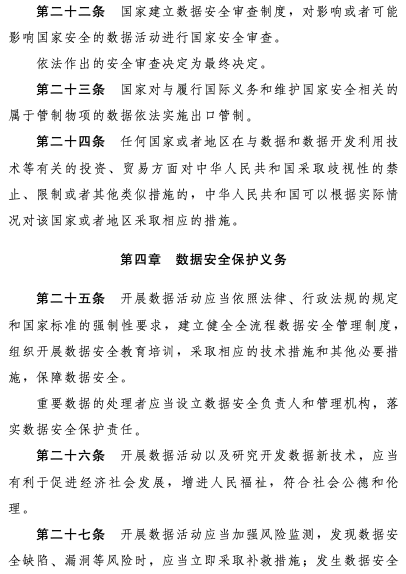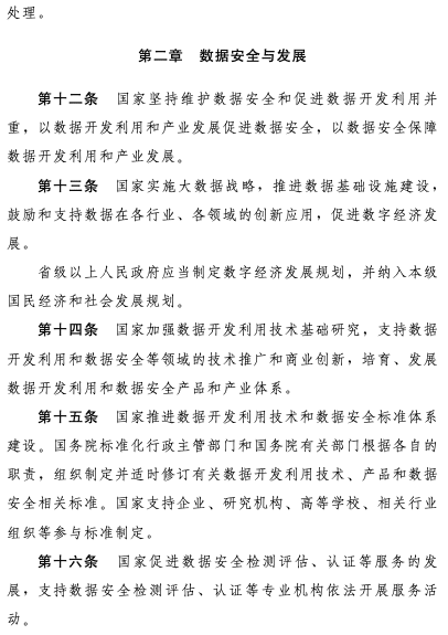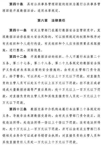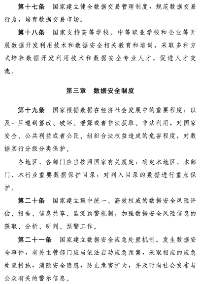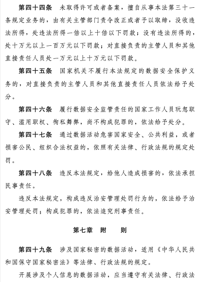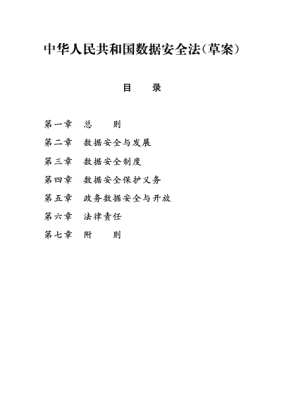 草案共分七章,依次为总则、数据安全与发展、数据安全制度、数据安全保护义务、政务数据安全与开放、法律责任和附则。