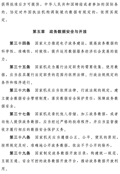 草案要求推进电子政务建设,提高政务数据的科学性、准确性、时效性,提升运用数据服务经济社会发展的能力;依照法律、行政法规的规定,建立健全数据安全管理制度,落实数据安全保护责任,保障政务数据安全。